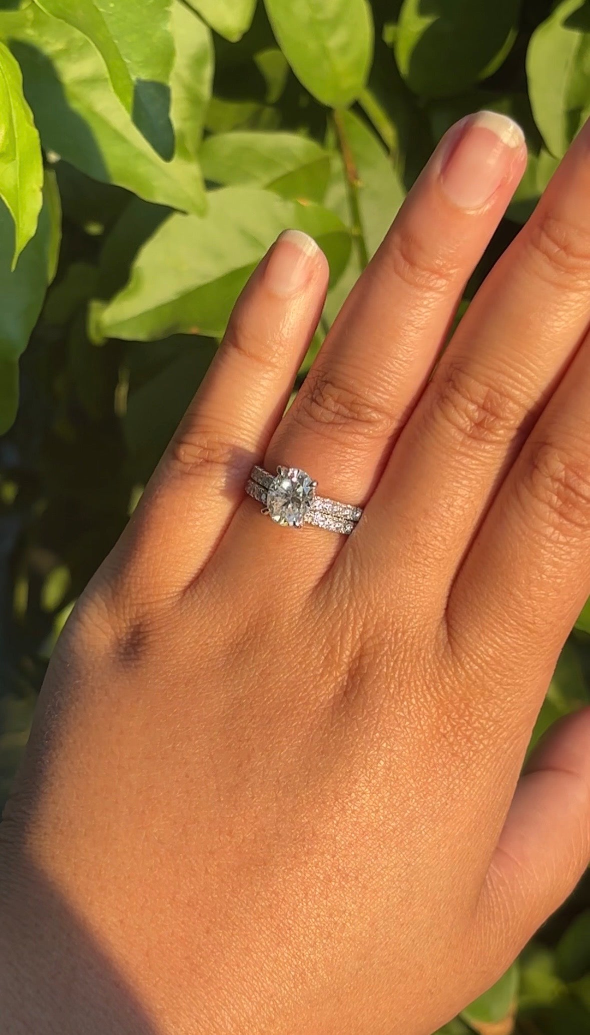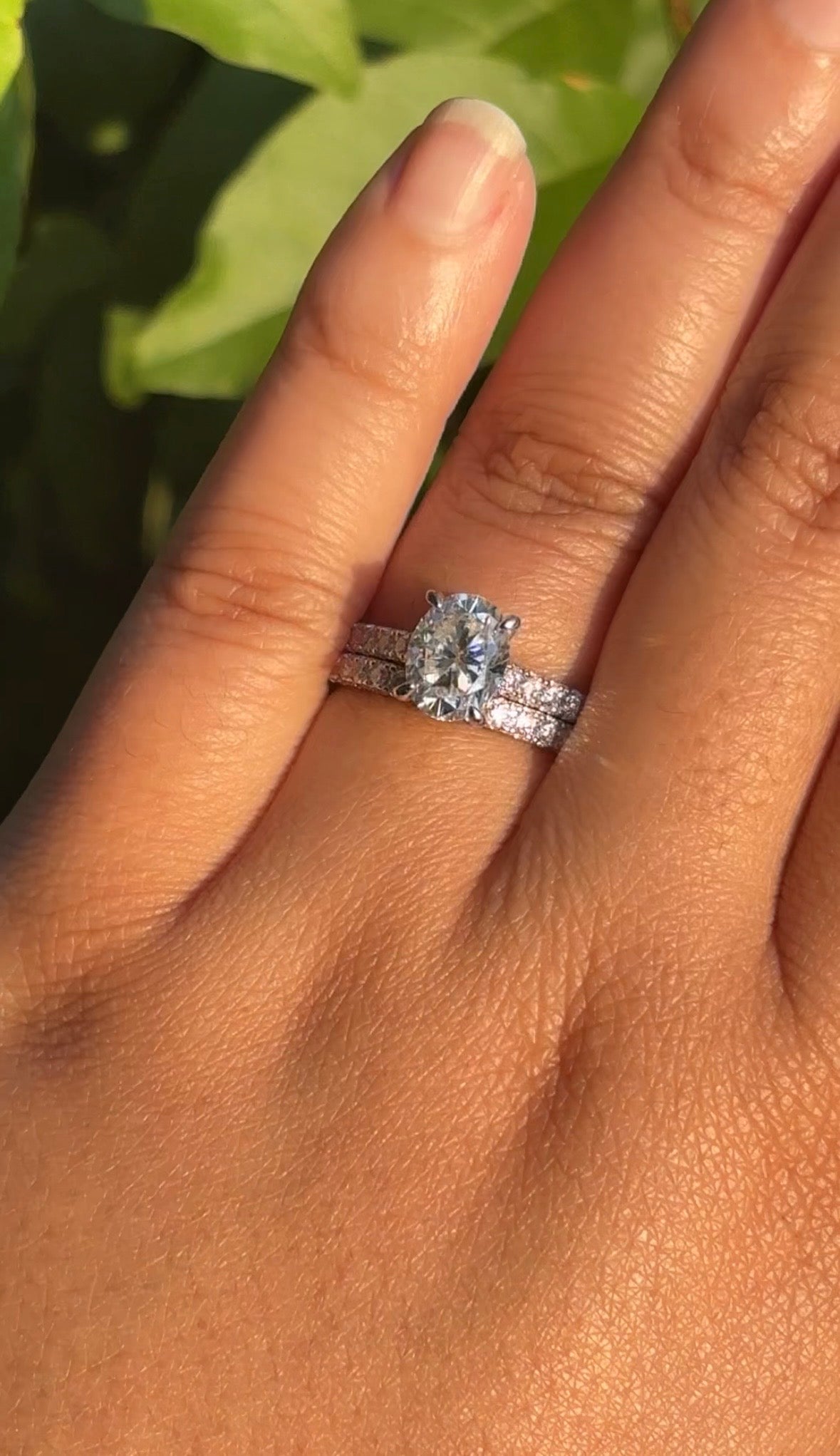 - Design: 2ct Oval Cut Stone, with hidden halo and stone-set bridge